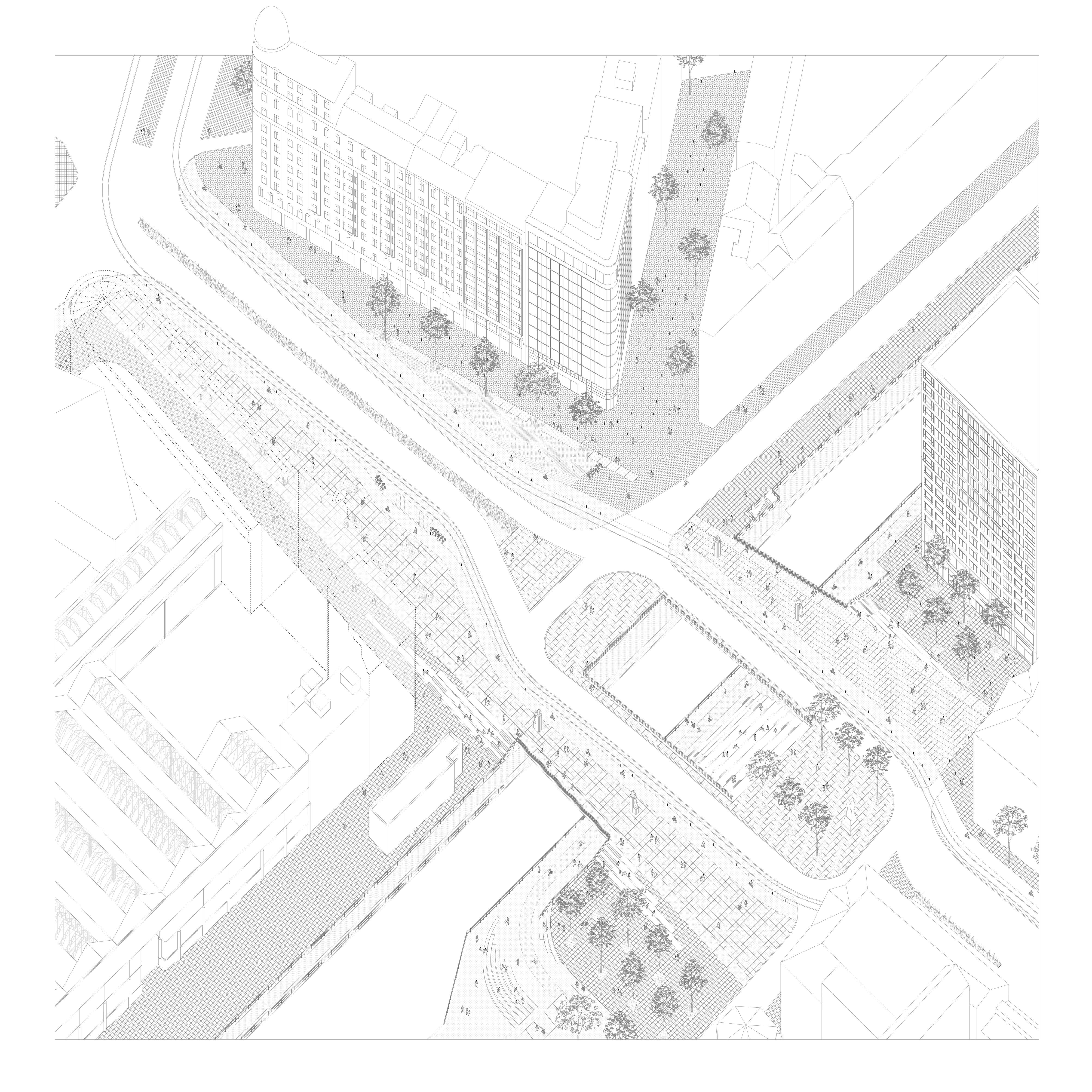 La création de passerelles piétonnes larges et confortables, offre un espace de séjour inédit. Un lieu à la croisée de deux grandes perspectives historiques : l’axe fluvial Charleroi-Willebroeck et l’axe Léopoldien Koekelberg-Botanique, des perspectives Nord-Sud et Est-Ouest au cœur d’une « boussole métropolitaine ».