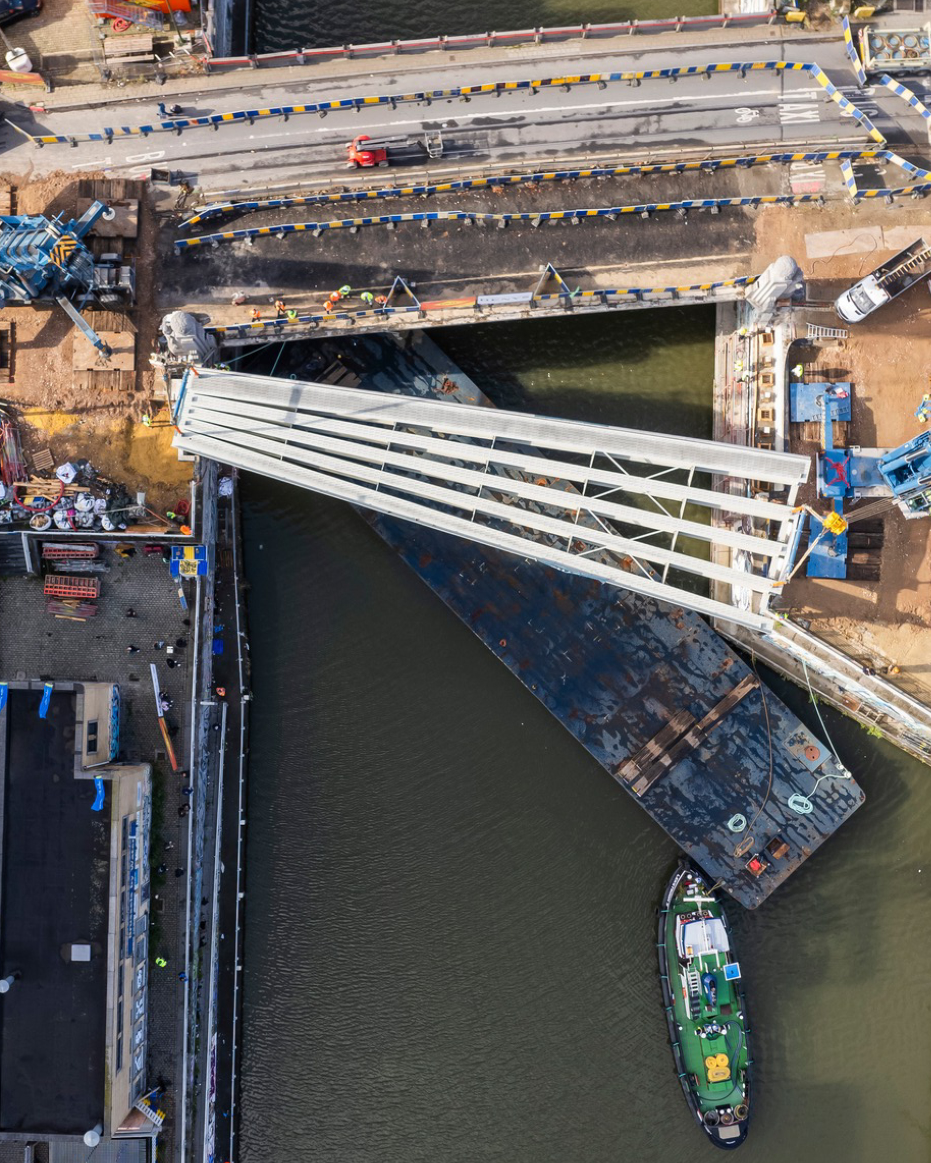 Les quatre statues Art déco sont maintenues en place. Si elles témoignent de la trace des ponts, elles se retrouvent néanmoins isolées du dispositif de garde-corps. Cette dissociation rend caduque l’idée de dessiner un garde-corps massif en pierre bleue, imaginé comme partie intégrante du pont. Au contraire, un nouveau garde-corps, en acier, vient souligner la finesse du tablier de l‘extension des ponts, et participe à faire exister la surface de l’espace central depuis l’axe du canal. Le monument aux navigateurs et le vartkapoen sont bien entendus maintenus.