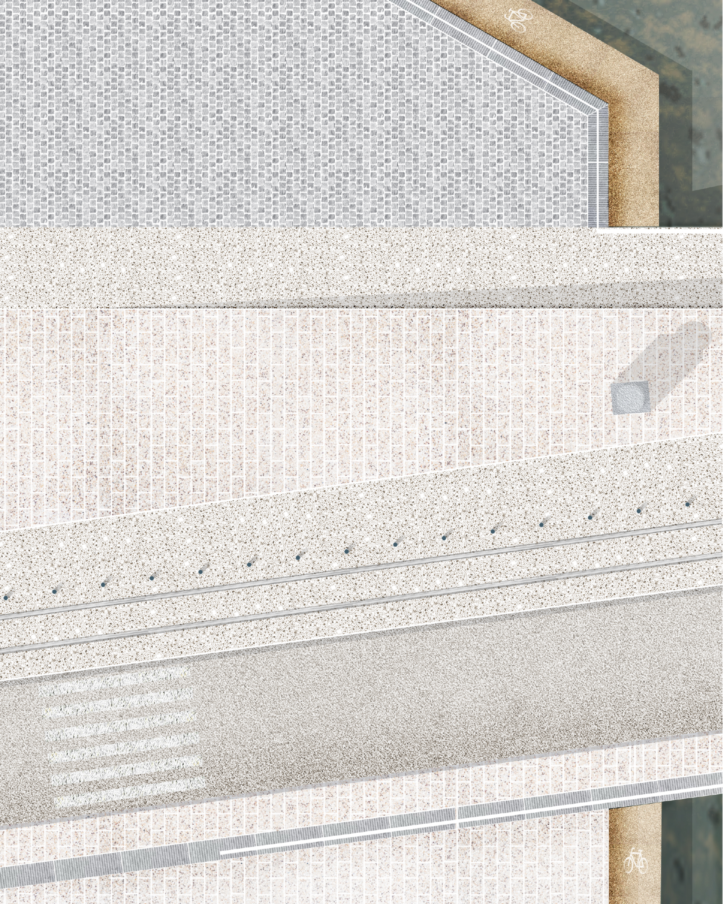 La définition de l’espace central se marque par l’utilisation de dalles de béton de grand format, qui tranche avec celui les espaces latéraux, qui, plus petit, renvoie aux trottoirs classiques et génériques à Bruxelles.